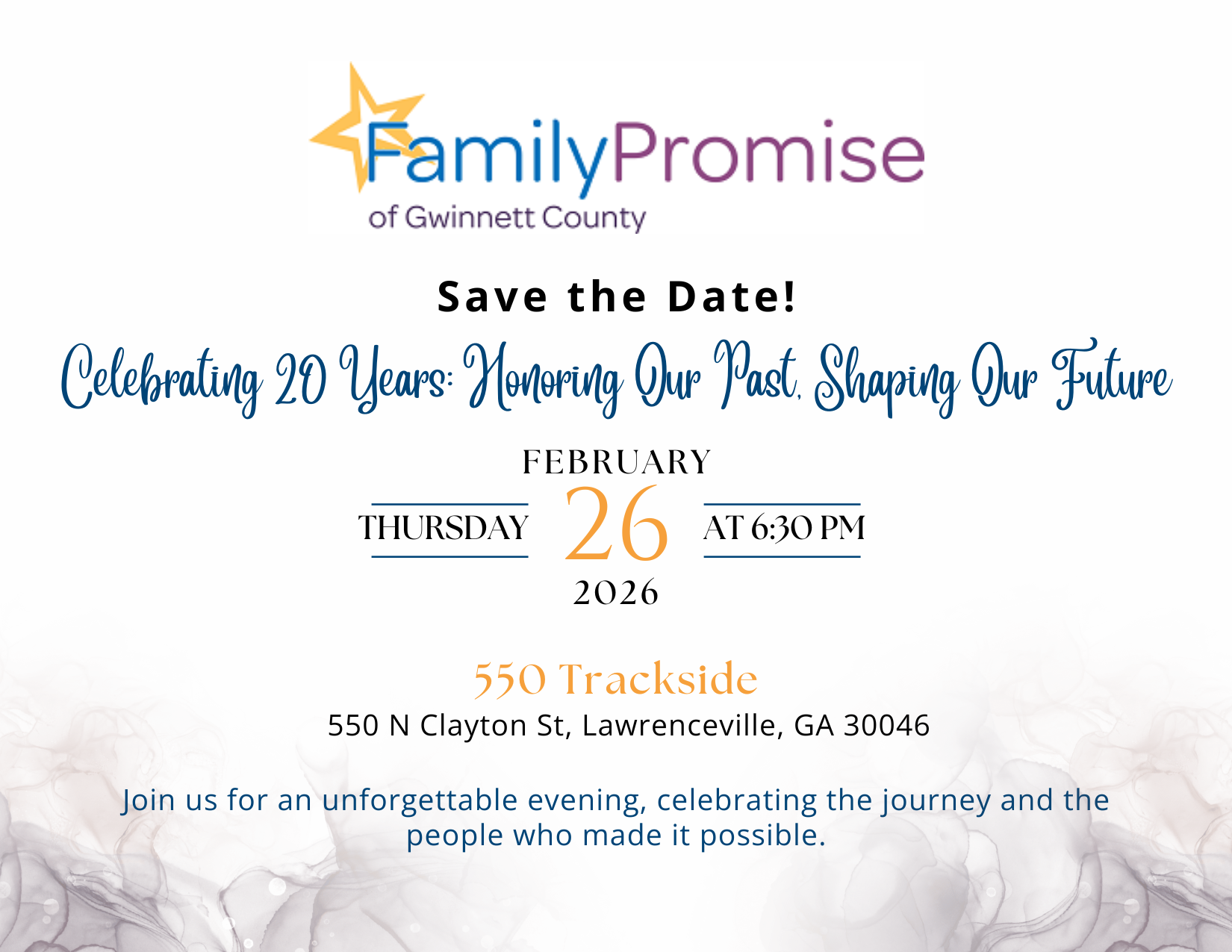 Family Promise of Gwinnett is turning TWENTY, that’s big 2-0! You’re invited to celebrate two decades of transforming lives! Mark your calendars and stay tuned because more details are coming soon!